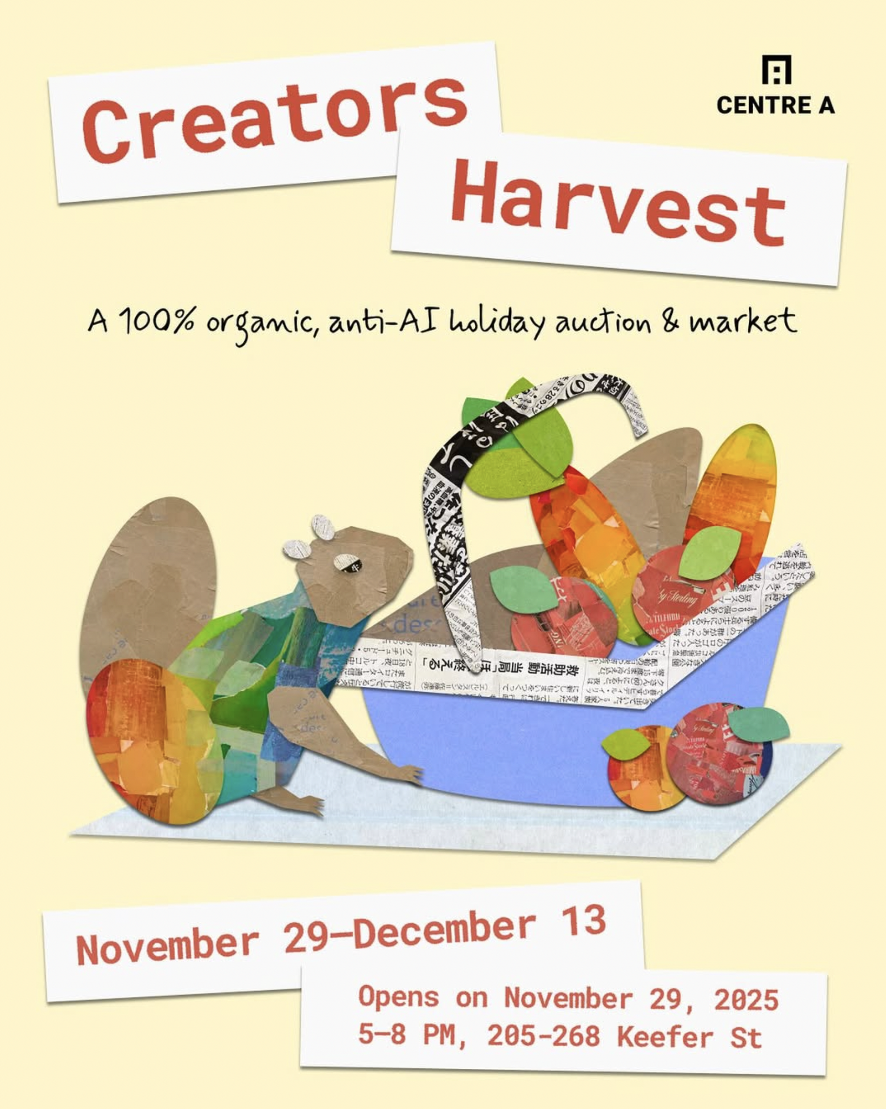 ‘Tis the season! Centre A would like to invite you and your loved ones to our 2025 Holiday Art Auction & Market, Creators Harvest. Join us as we celebrate 100% organic, non AI-generated works made lovingly by local artists and craftspeople. This year, we invited artists to dream up worlds beyond the whims of the algorithm. Come one, come all, and come as you are! Come weird, bumpy, bruised, or not fully ripened. See you on Opening Night on November 29, 5–8 PM!